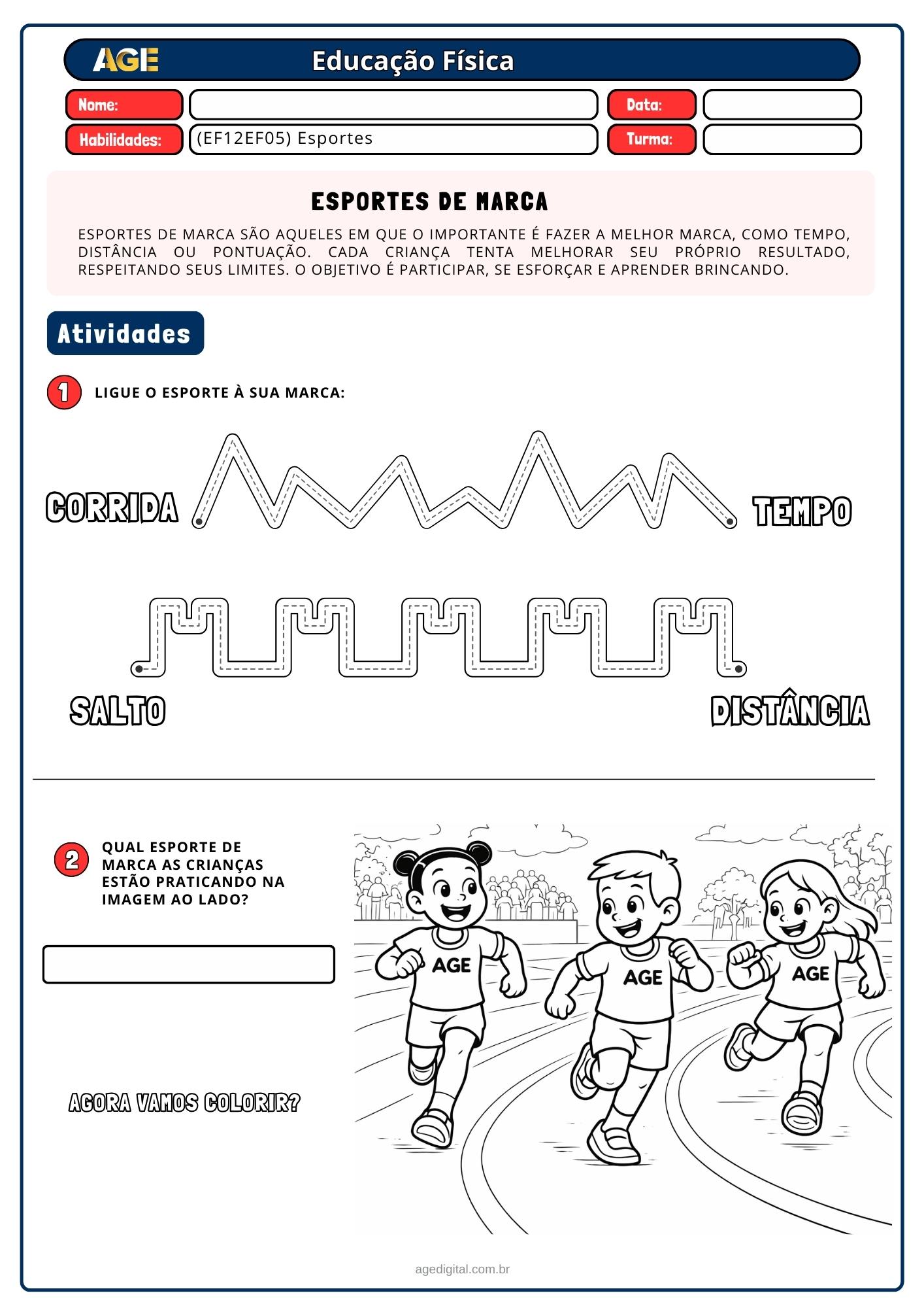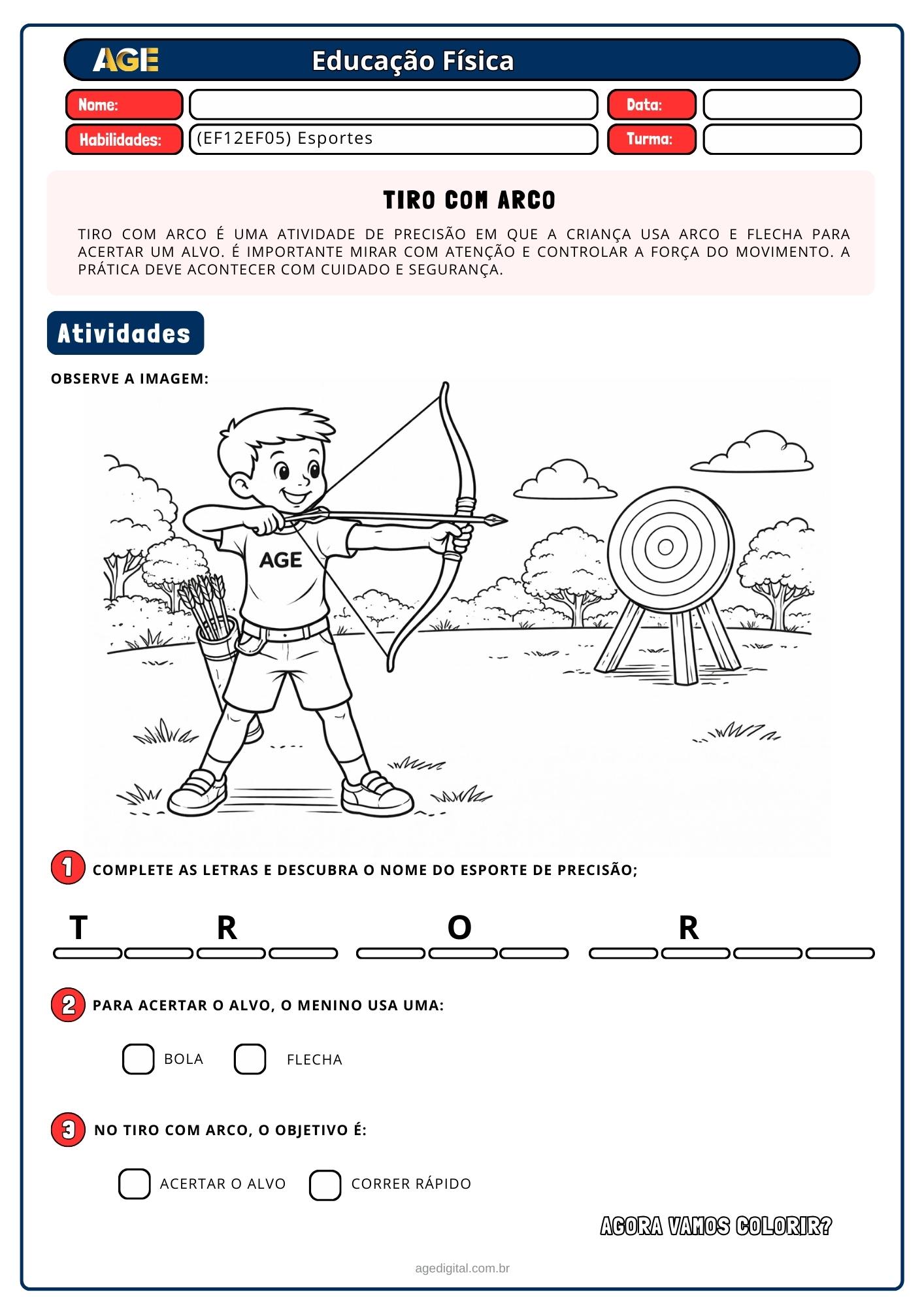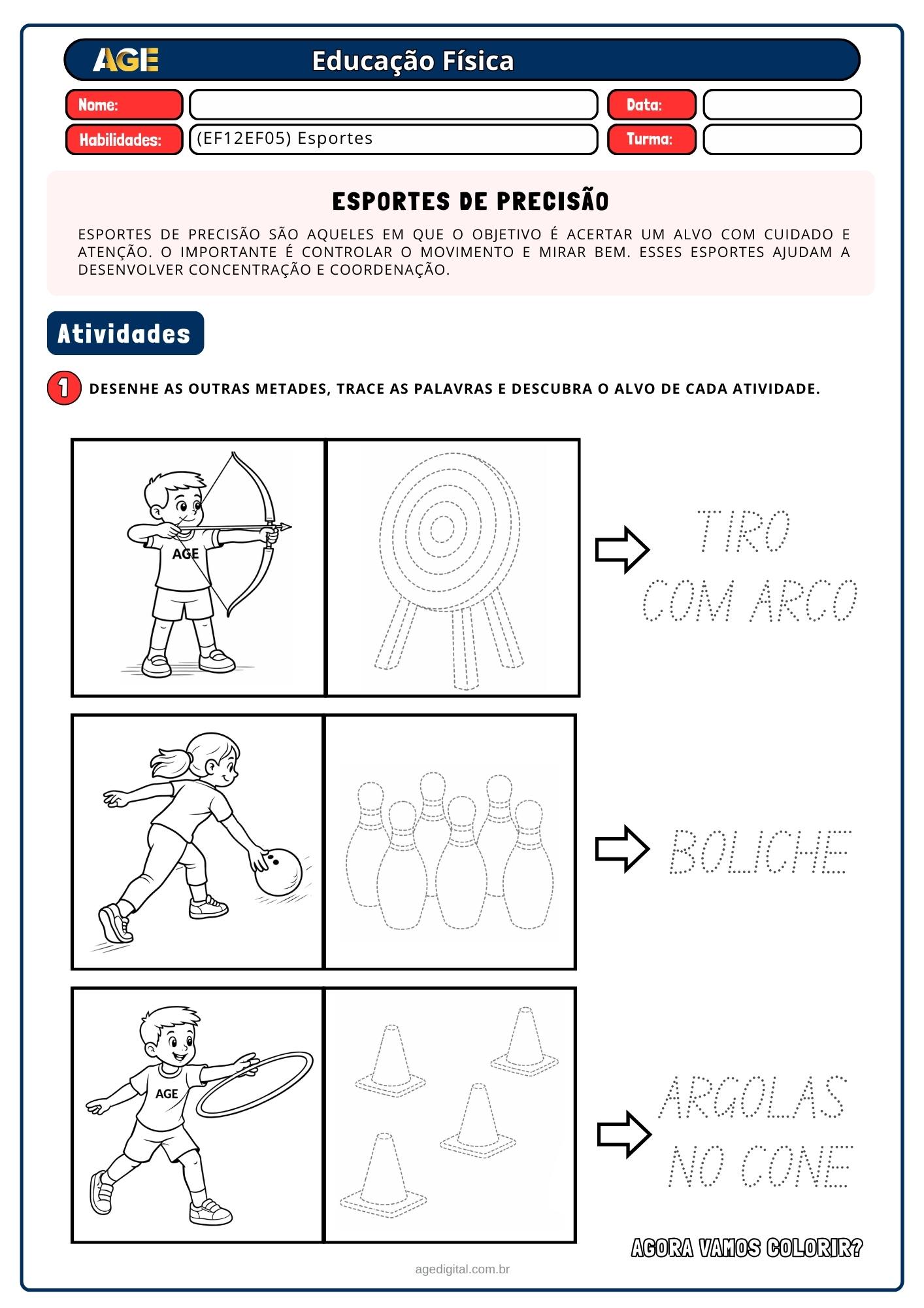 Esportes de marca e de precisão, explorando corrida, salto, arremesso, boliche, tiro com arco, sinuca e jogos de pontaria, sempre de forma lúdica e segura.