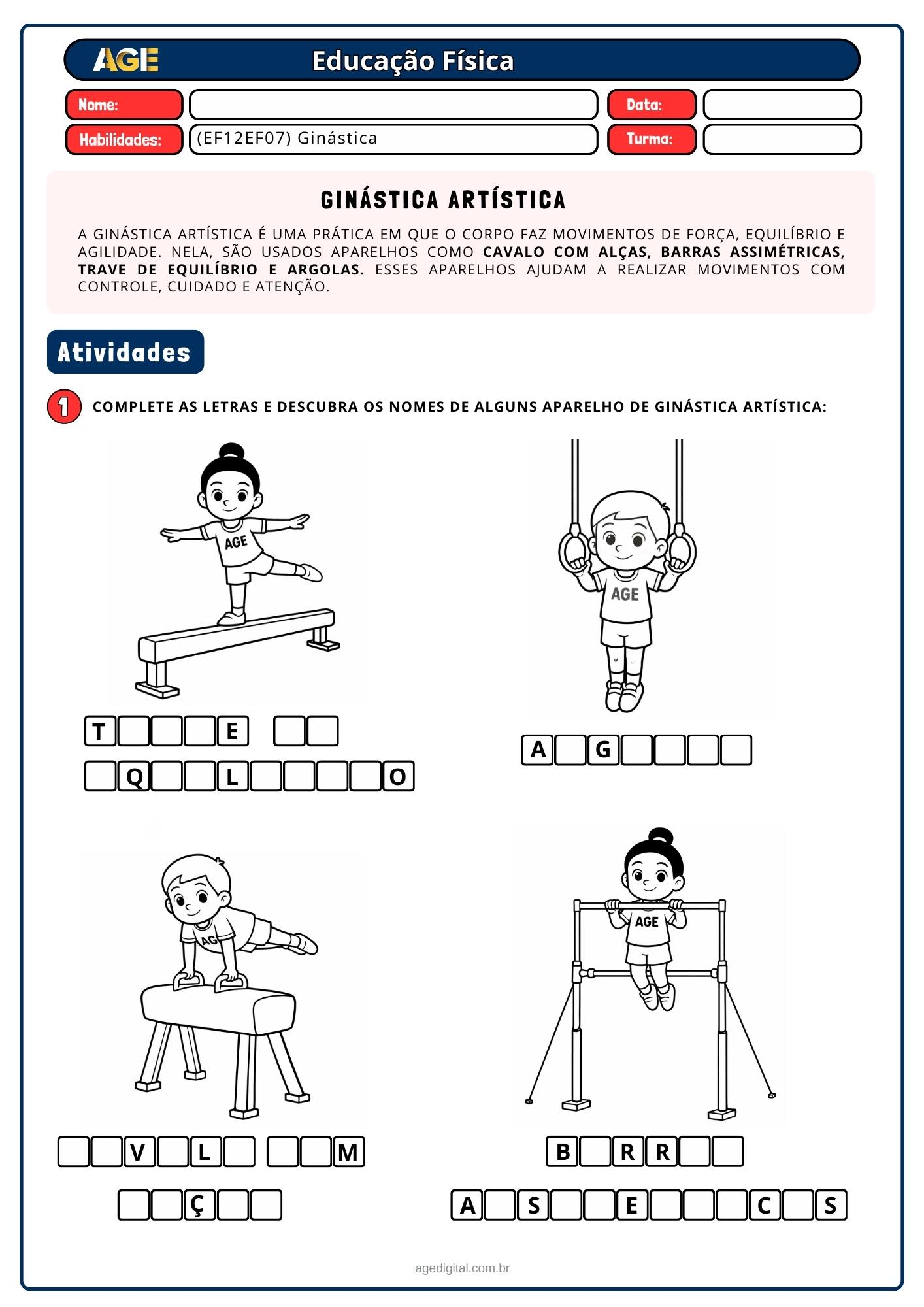 Ginástica geral com elementos como equilíbrio, saltos, giros, deslocamentos, ginástica rítmica e artística, respeitando os limites e a coordenação das crianças.