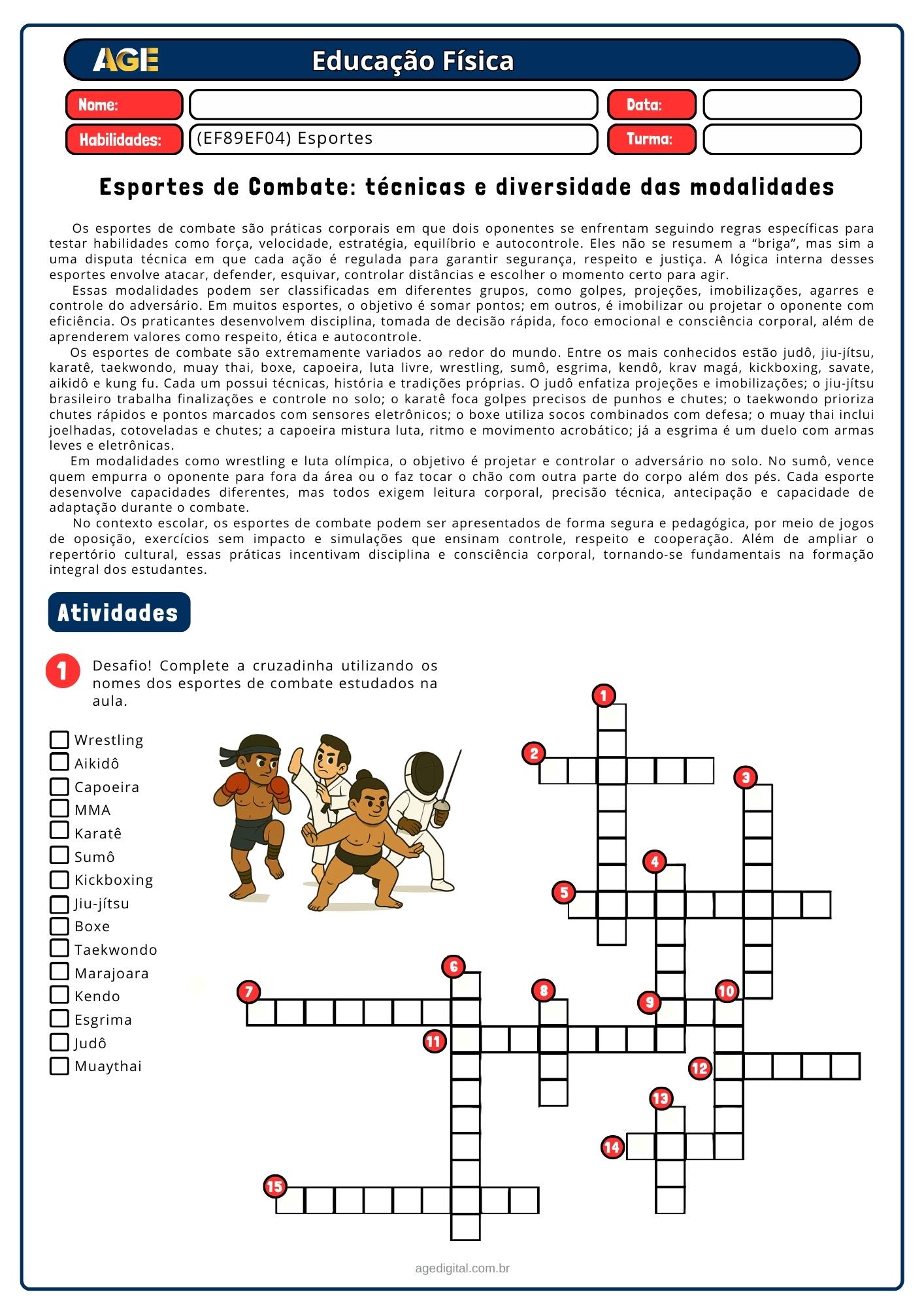 Lutas do mundo e lutas brasileiras, abordando princípios técnicos, regras, ética, respeito e cultura corporal.