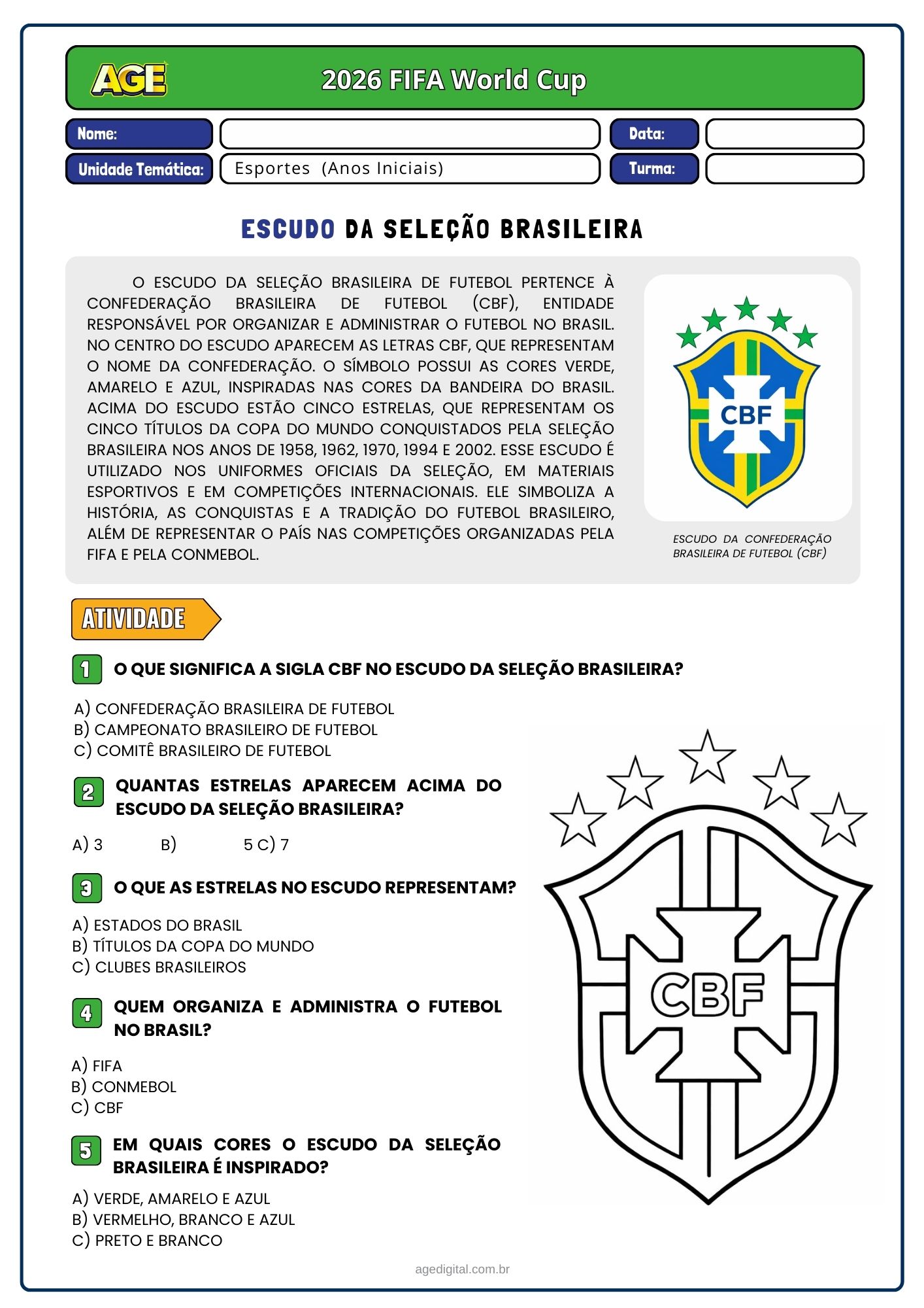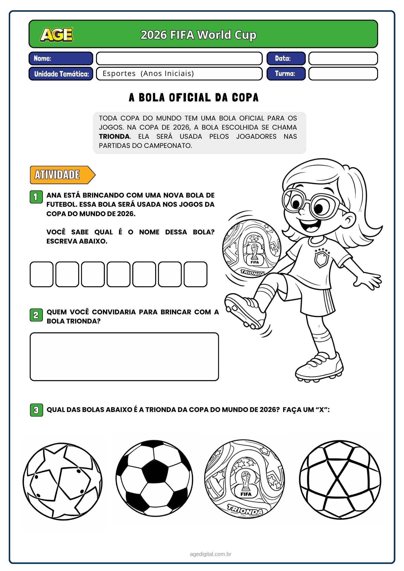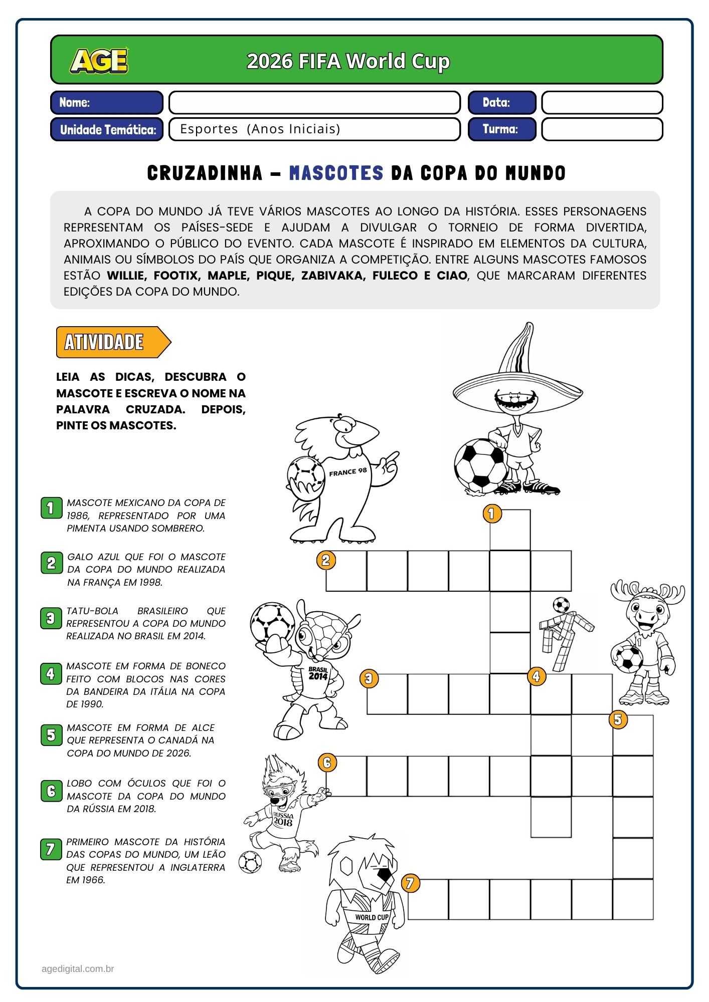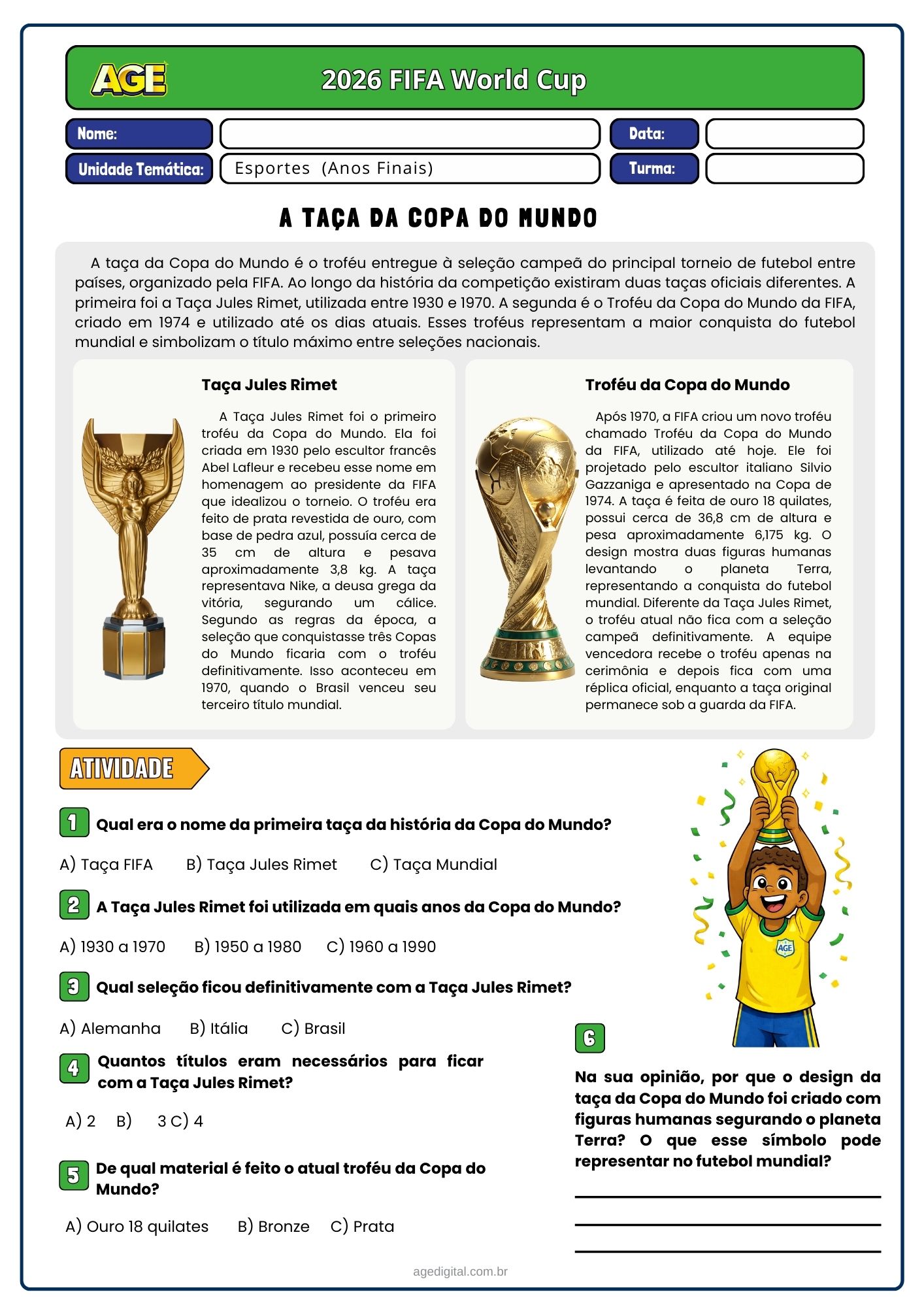 Este material foi desenvolvido para trabalhar a Copa do Mundo de forma pedagógica e atual, conectando os alunos com um dos maiores eventos esportivos do mundo.