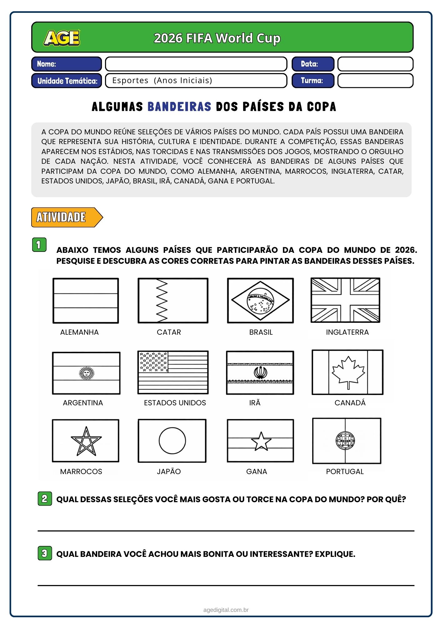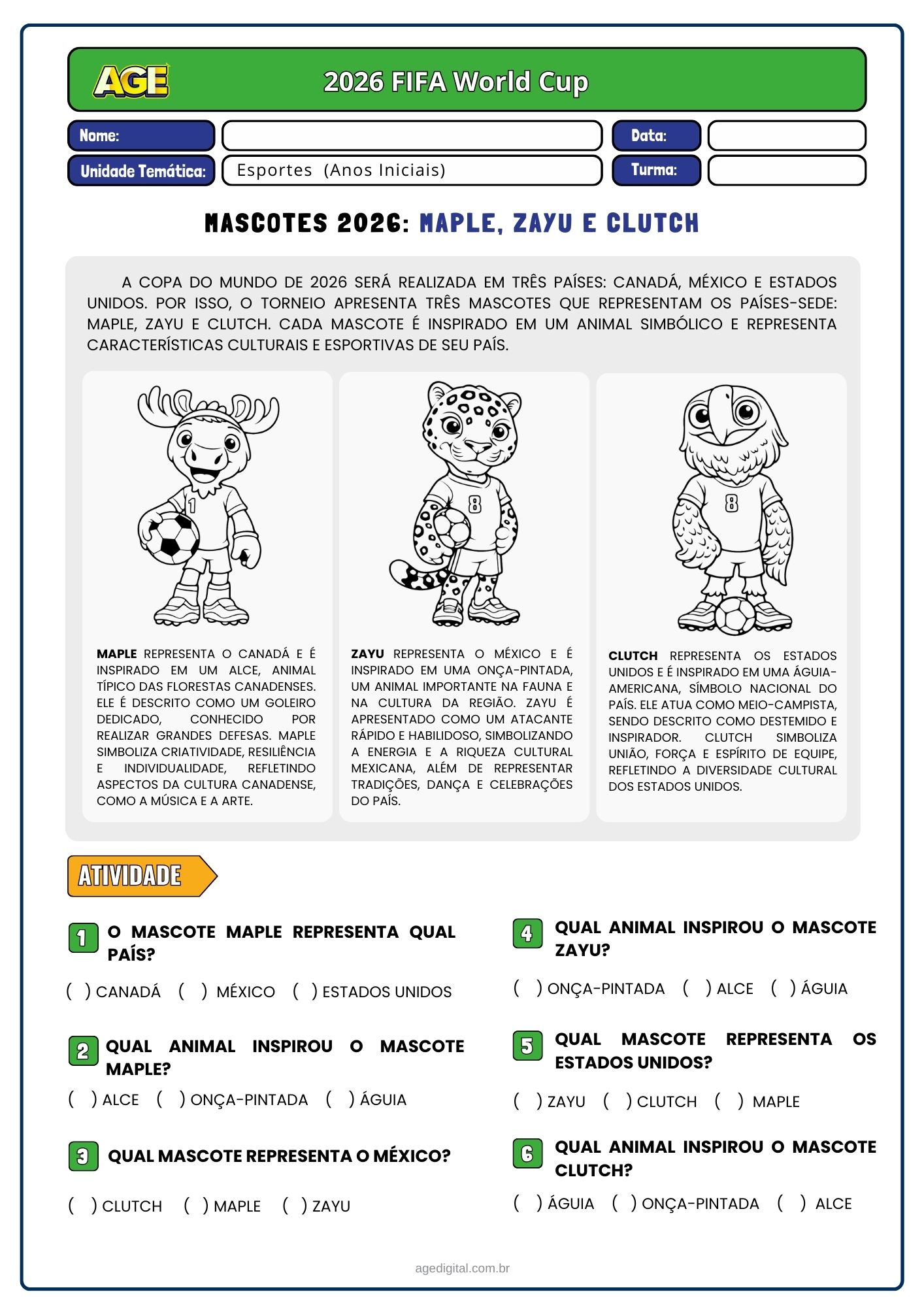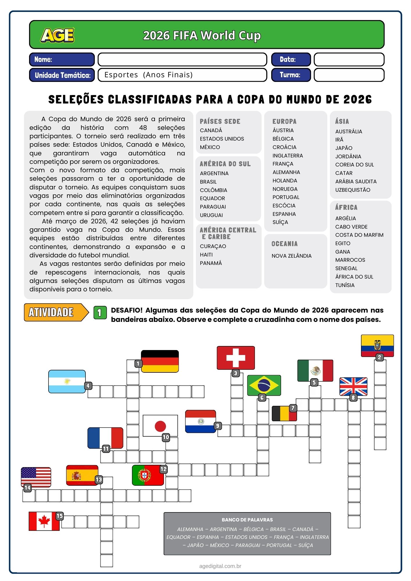• Atividades teóricas sobre a Copa do Mundo 2026